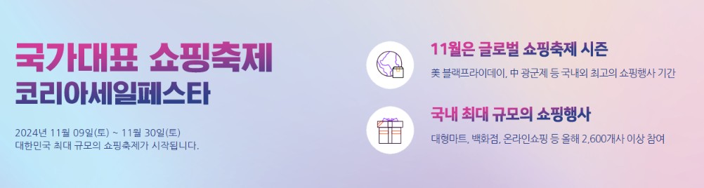 2024 코리아세일페스타는 국가대표 쇼핑축제로 11월 9일부터 11월 30일까지 22일간 진행됩니다.